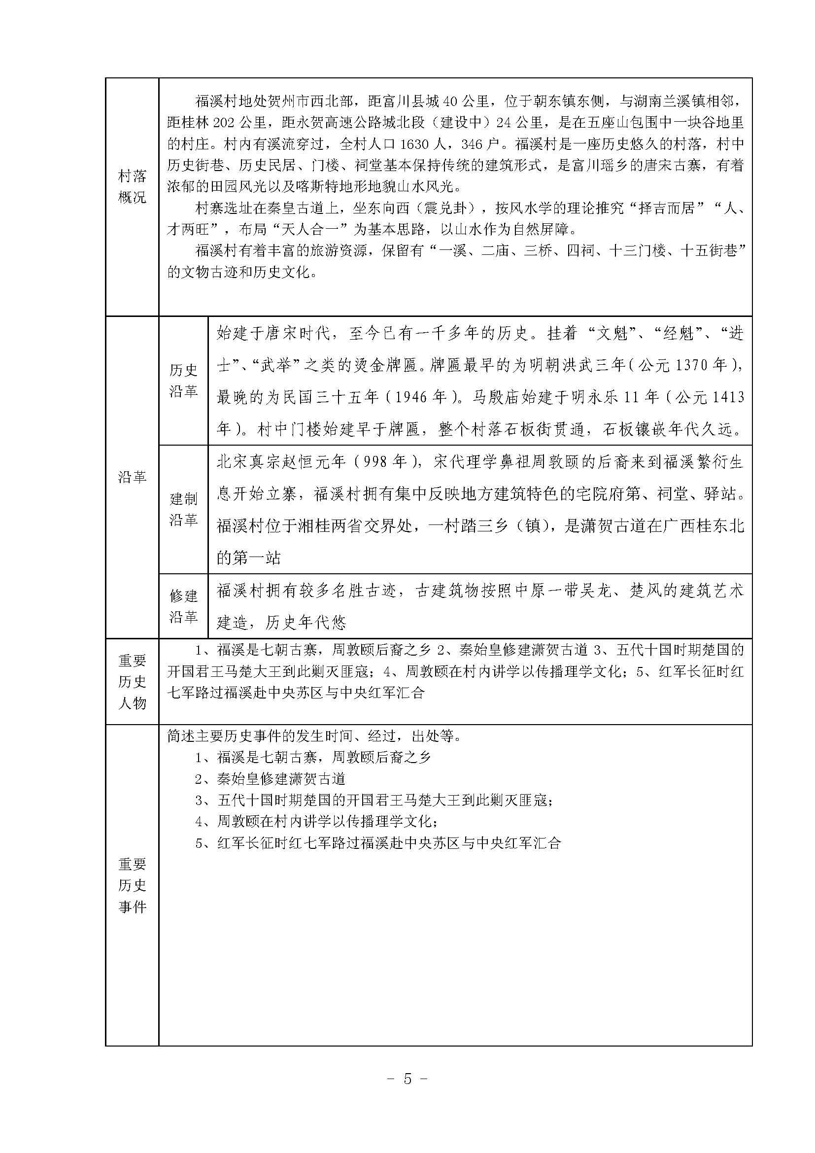 古寨原名叫沱溪,唐时住人,宋时立寨,至今已有一千多年的历史。据其《福溪源流记》所载:"厥予村境蒋、周、陈、何各县贤祖列宗,分异邑郡县,于唐末宋初先后不一地迁徙而来。其初地形凹凸高低不等,故名为沱溪。后经祖先辛勤僻野开拓,扩展兴修建砌,物丰丁旺,安居乐业,更名福溪矣!"村中何姓祠堂大门东侧的粉壁上写有该姓祖先由秦朝都城咸宁搬迁到此经过的《乡官路引歌》,其诗曰:"寿光辞别出湖常,无锡会坛步凤阳;婺源石棣东流过,九江彭泽娶妻黄;停住德安居九载,随身六子到萍乡;万载亦居年十四,五六咸宁至武昌;大冶衡阳酃县富,蓝山永郡道州庄;路遥五万三千里,万水千山卜福坊!"从诗里他们搬迁路线中"永州-道州"至富川的这一段,正是潇贺古道的北段主干道,从中我们可以推断出,福溪村的何姓先民,正是经由秦之潇贺古道、汉之楚粤通衢搬迁到此建寨定居的。