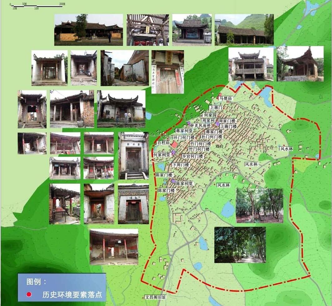 据村人介绍,村中原先有二十四座庙宇,二十四座戏台。庙宇中暮鼓晨钟,香客往来,戏台上丝竹悦耳,好戏连台,体现当时的人文景观。由于时代更替世事沧桑,其中仅有一部分庙宇和戏台得以保存下来。现有的几座庙宇和古戏台富丽堂皇,结构精美,造型别致,令人赞叹。特别是村人为纪念后唐末年马楚大王剿灭匪寇、建立地方政权、开拓福地使民众安居乐业等功德所建的百柱庙(亦称马楚大王庙),更是特色独具。马楚大王庙原来规模较小,初建于唐末宋初,直到明永乐十一年(公元1413年)才拆除小庙,增制增容,在原地重新扩建。到明弘治十二年(公元1499年)扩建得规模更雄伟,设备更完善。整座庙宇皆用质坚如石的古楠、大水杉木、香檀木建成,十分堂皇和珍贵。该庙高6.13米,进深21.94米,面宽20.86米,由76根高2-5.5米、直径20-30厘米的粗大圆木柱和44根吊柱、托柱支撑而成。这座120根格木大柱建成的古庙就座落在灵溪河畔,所以人们又叫它灵溪庙。